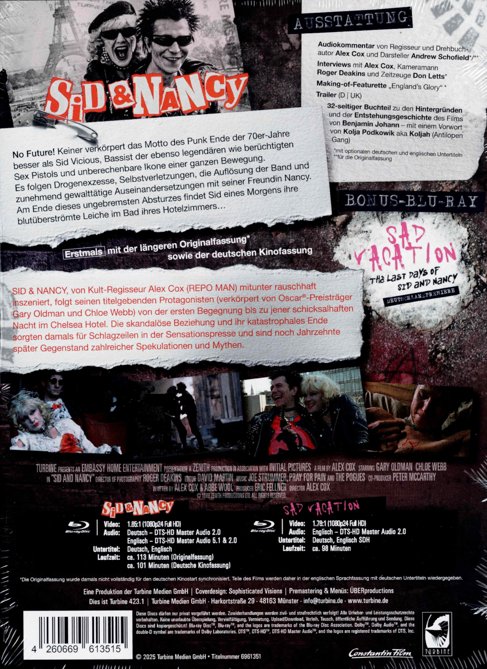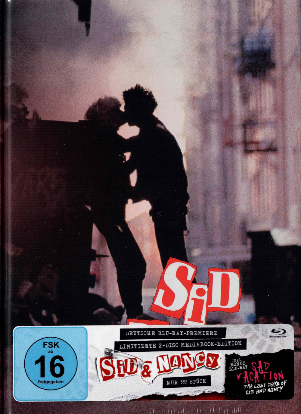 Das Mediabook - Cover B - ist (wie auch die anderen beiden Covermotive) auf 333 Exemplare limitiert (ohne Limitierungsnummer) und beinhaltet den Film auf Blu-ray Disc sowie eine Bonus-Disc mit dem Dokumentarfilm Sad Vacation: The Last Days of Sid and Nancy.