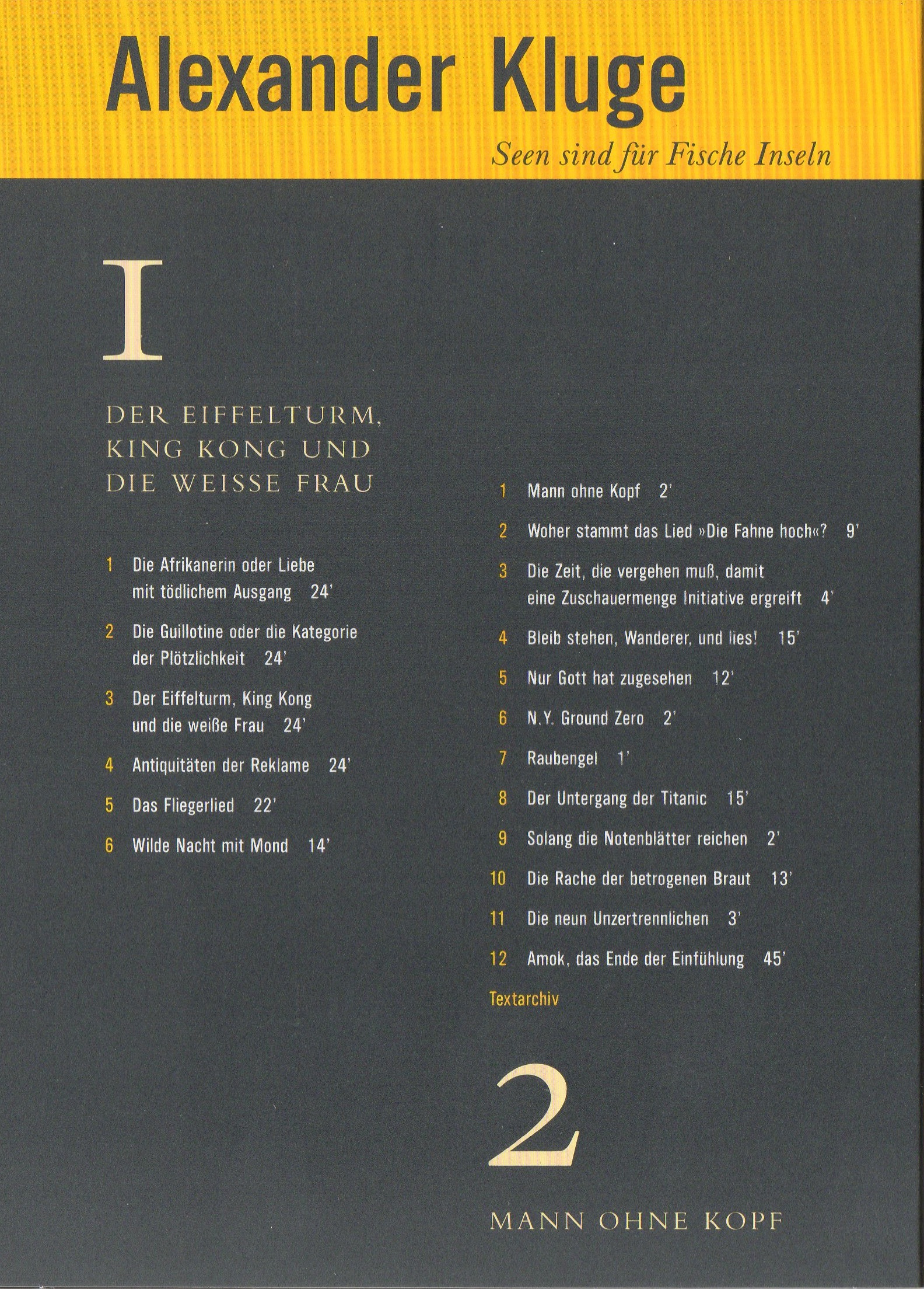 Einer von 137 Kurzfilmen in einer Sammelbox mit 7 Doppel-DVDs in Digipacks mit Fernseharbeiten Alexander Kluges von 1987 bis 2008. Die Sammlung beinhaltet zudem ein 224-seitiges Hardcover-Beibuch (4-farbig bebildert) mit Texten von Alexander Kluge und Martin Weinmann, alles zusammen in enem Schuber