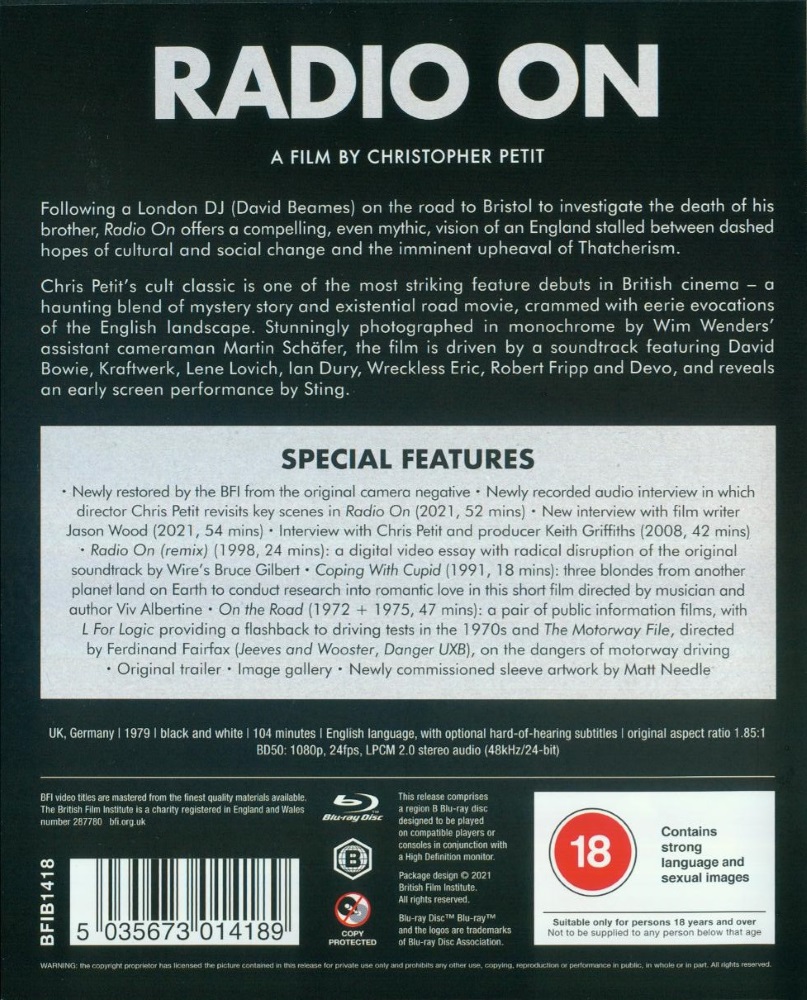 Stunningly photographed in monochrome by Wim Wenders' assistant cameraman Martin Schäfer, Radio On is driven by a startling new wave soundtrack featuring David Bowie, Kraftwerk, Lene Lovich, Ian Dury, Wreckless Eric, Robert Fripp and Devo, and reveals an early screen performance by Sting.