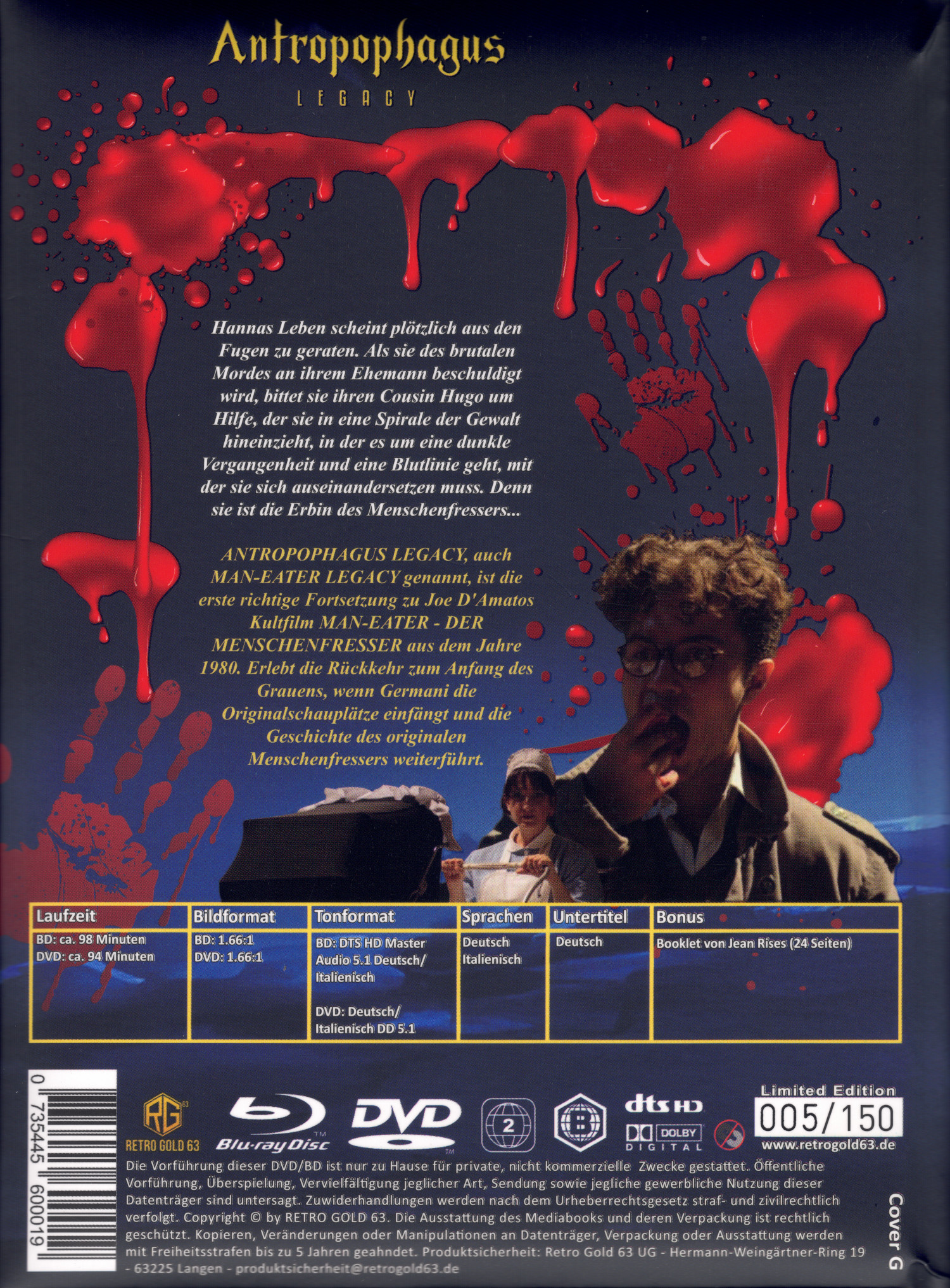 Auf 150 Exemplare limitiertes und rückseitig durchnummeriertes Mediabook mit dem Covermotiv G, welches den Film auf Blu-ray und DVD enthält. Die Veröffentlichung ist ungeprüft, daher ist weder auf dem MB noch auf den Discs ein FSK-Logo vorhanden. Die Informationen auf der Rückseite sind aufgedruckt. Das MB ist wattiert.