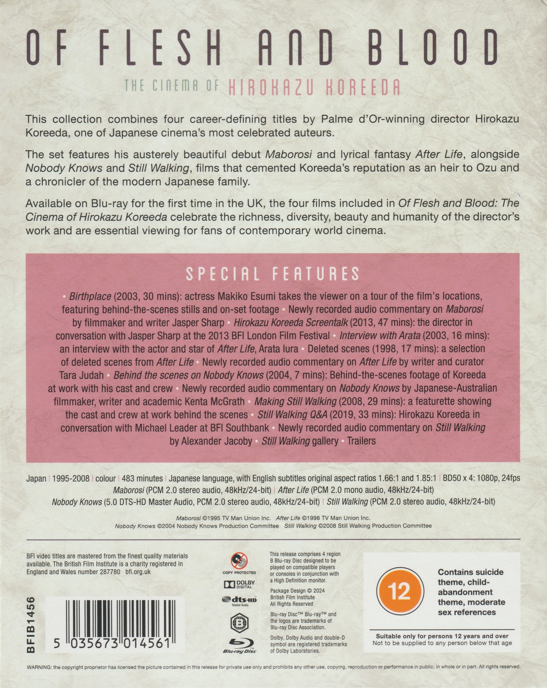 Der vollständige Name der Edition lautet: Of Flesh and Blood - The Cinema of Hirokazu Koreeda. Es handelt sich um eine Neuauflage der BFI-Edition von 2019. Die Veröffentlichung besteht aus einem 4-Disc-Scanavo-Case, das in einem nach oben und unten geöffneten Pappschuber steckt.