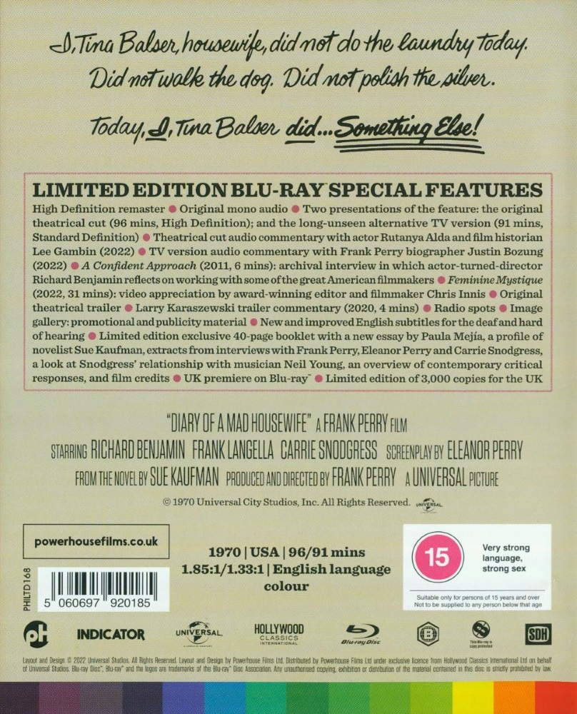 Superbly directed by Frank Perry (The Swimmer, Play It as It Lays), with a scathing screenplay by Eleanor Perry (David and Lisa, Ladybug Ladybug), Diary of a Mad Housewife tells the story of Tina Balser (Carrie Snodgress, The Fury, Pale Rider) a frustrated housewife trapped in an unhappy marriage to an insufferably controlling, status-obsessed bore (Richard Benjamin, Catch-22). Tina seeks solace in a fling with an abusive lover, the arrogant writer Georg Prager (Frank Langella, Dracula), who treats her like a sex object, leading to therapy and further unhappiness.