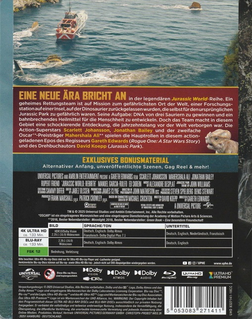 Erschienen im limitierten Steelbook mit J-Card und ohne Info über die Limitierungshöhe. Das Steelbook besitzt eine kleine Prägung auf der Vorderseite oben links beim Jurassic Park-Logo.
