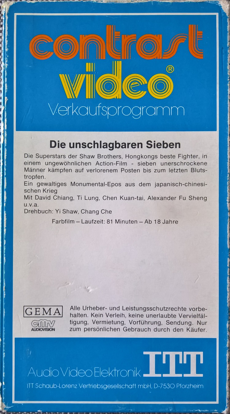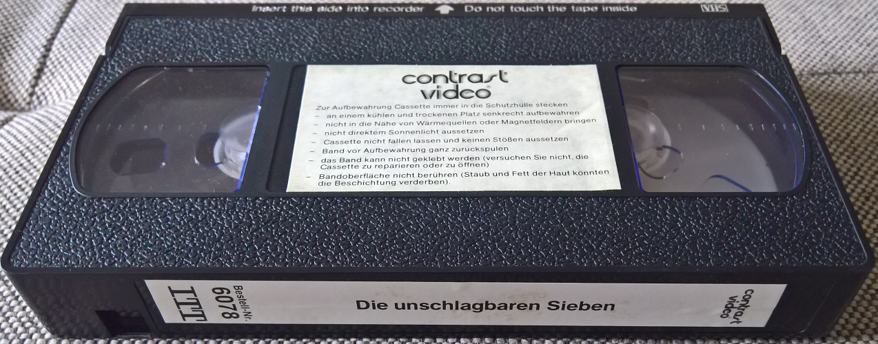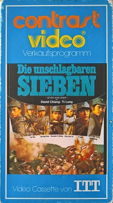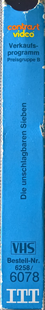 "Die unschlagbaren Sieben" ist Anfang der 80er Jahre stark gekürzt von ITT Contrast im Pappschuber erschienen. Vor dem Film kommt ein ITT Einspieler, keine Trailer. Der Vorspann ist hier in Englisch und am Anfang wird der deutsche Titel eingeblendet.Im Besitz von 7 Benutzern.