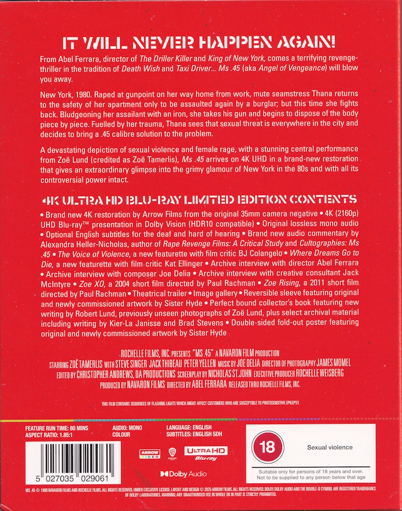 A devastating depiction of sexual violence and female rage, with a stunning central performance from Zoë Lund (credited as Zoë Tamerlis), Ms. 45 arrives on 4K UHD in a brand-new restoration that gives an extraordinary glimpse into the grimy glamour of New York in the 80s and with all its controversial power intact.