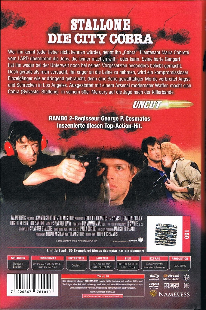 INFO: Auf der beiliegenden DVD ist nur die geschnittene FSK 18-Fassung zu finden! Die Szene im Showdown (Cobretti spießt den Nightripper auf einen Haken und lässt ihn verbrennen) fehlt hier fast komplett.