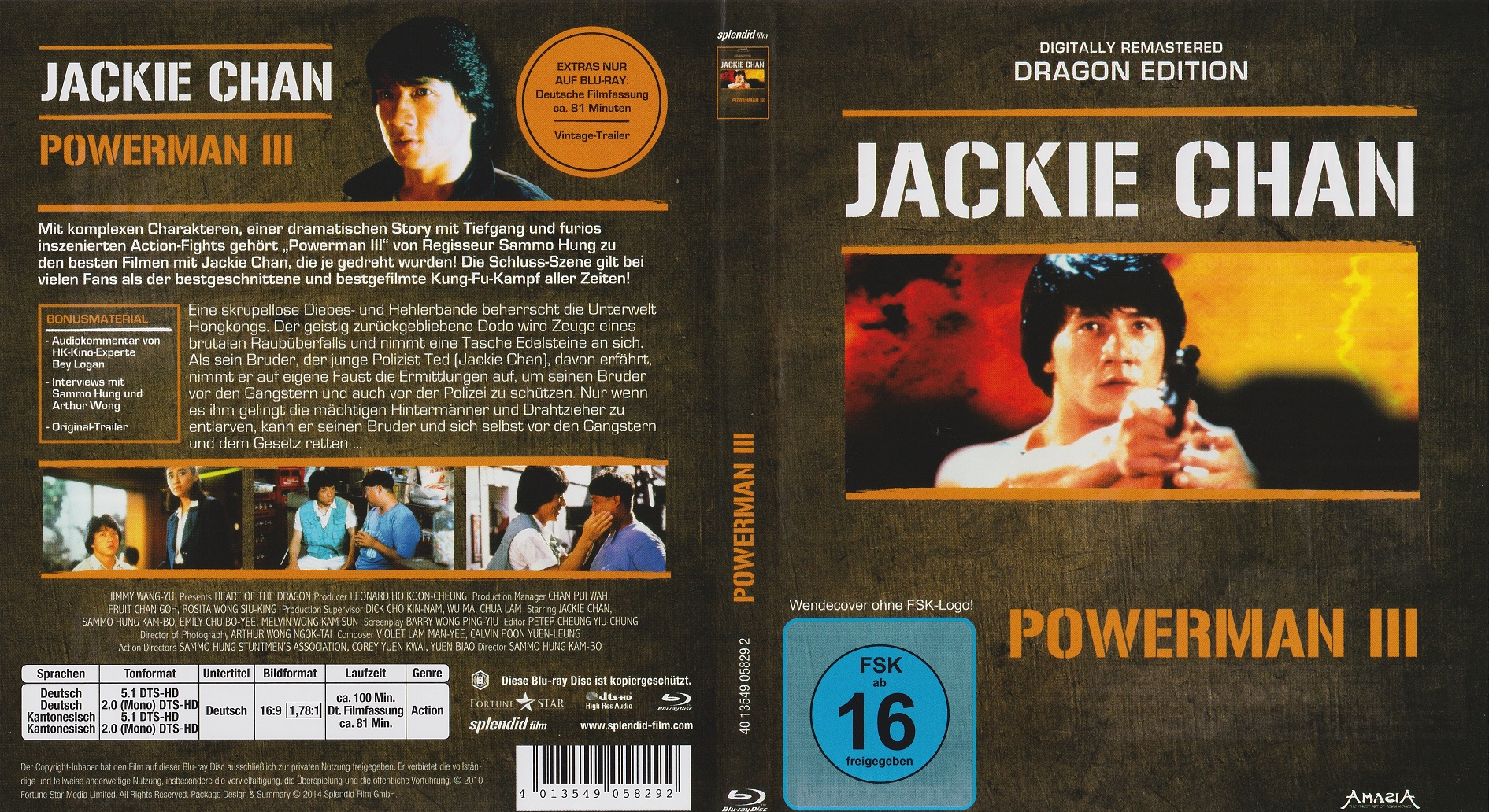 Zum ersten Mal überhaupt ist die Japan-Fassung außerhalb Japans am Stück zu sehen.Wir bekommen einen nativen HD-Transfer auf der Blu-ray präsentiert. Zugegeben, hier gibt es bei bei Weitem kein Referenzbild zu bewundern, aber dieser Transfer stellt viele der Fortune Star Upscales in den Schatten.Die zahlreichen Extras wurden wohl von der britischen Hong Kong Legends DVD und der Fortune Star DVD aus Hongkong zusammengestellt.
