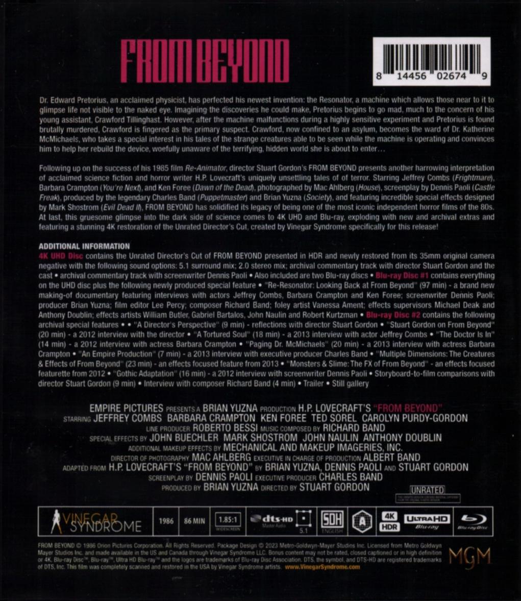 "Re-Resonator" (94:43, HD) an extensive making-of for "From Beyond," featuring interviews with producer Brian Yuzna, composer Richard Band, photographic effects supervisor Anthony Doublin, editor Lee Percy, prosthetic artist Mark Shostrum, special effects artists Robert Kurtzman and John Naulin, fabrication crew member Gabe Bartalos, makeup artist William Butler, screenwriter Dennis Paoli, foley artist Vanessa Ament, and actors Jeffrey Combs, Barbara Crampton, and Ken Foree