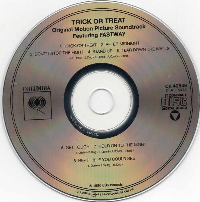(Soundtrack - Fastway - "Trick or Treat") - 1. Trick or Treat (2:47 Min.) - 2. After Midnight (3:39 Min.) - 3. Don't stop the Fight (4:21 Min.) - 4. Stand up (4:04 Min.) - 5. Tear down the Walls (2:07 Min.) - 6. Get tough (3:30 Min.) - 7. Hold on to the Night (3:22 Min.) - 8. Heft (5:19 Min.) - 9. If you could see (4:34 Min.)