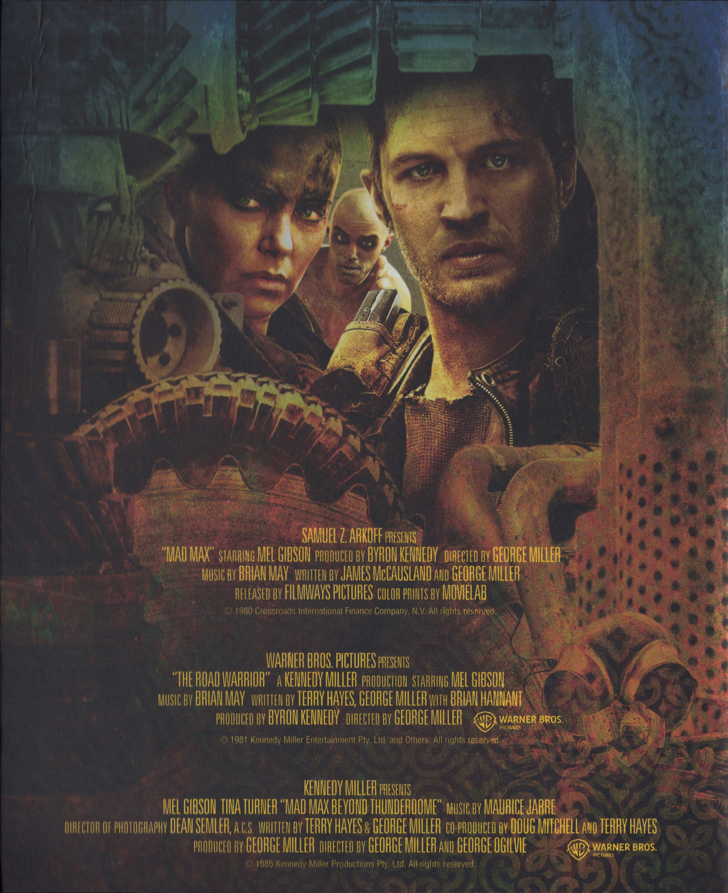 Die Teile 1-3 sind ausschließlich auf UHD enthalten, Mad Max Fury Road ist zusätzlich auf Blu-ray in der Black & Chrome Edition enthalten, Furiosa: A Mad Max Saga ist zusätzlich auf UHD als Black & Chrome Edition enthalten. Des Weiteren liegt noch eine Blu-ray mit Special Features bei. Außerdem sind sechs Artcards enthalten, deren Rückseiten zusammengelegt ein weiteres Motiv ergeben.