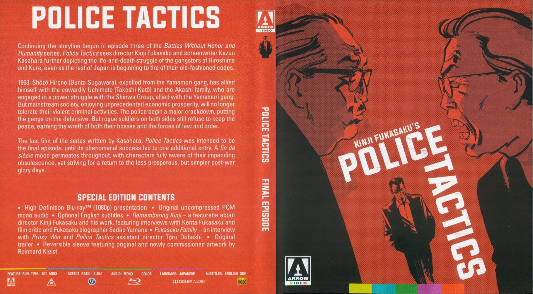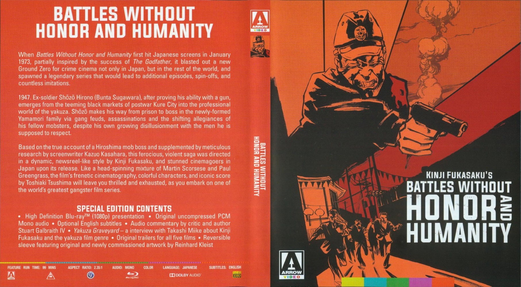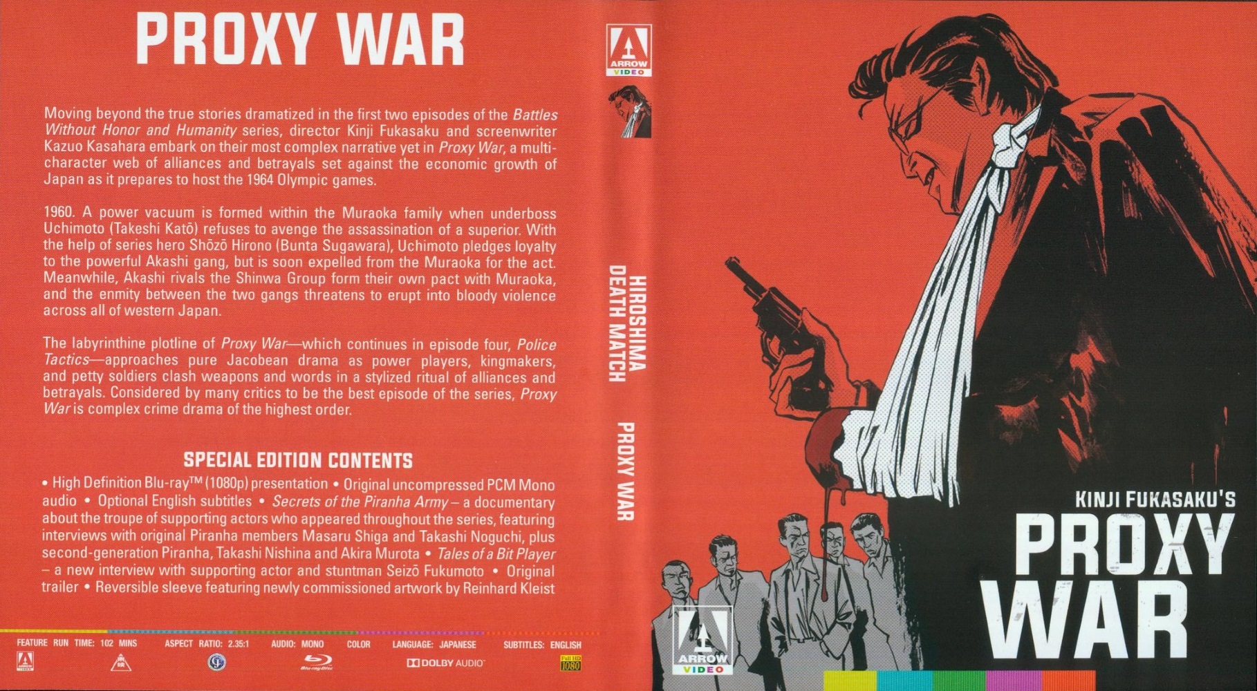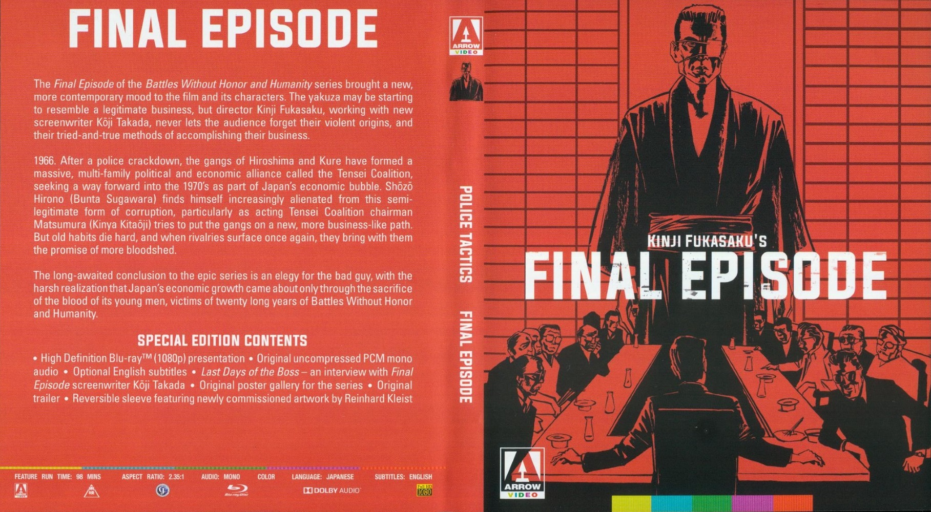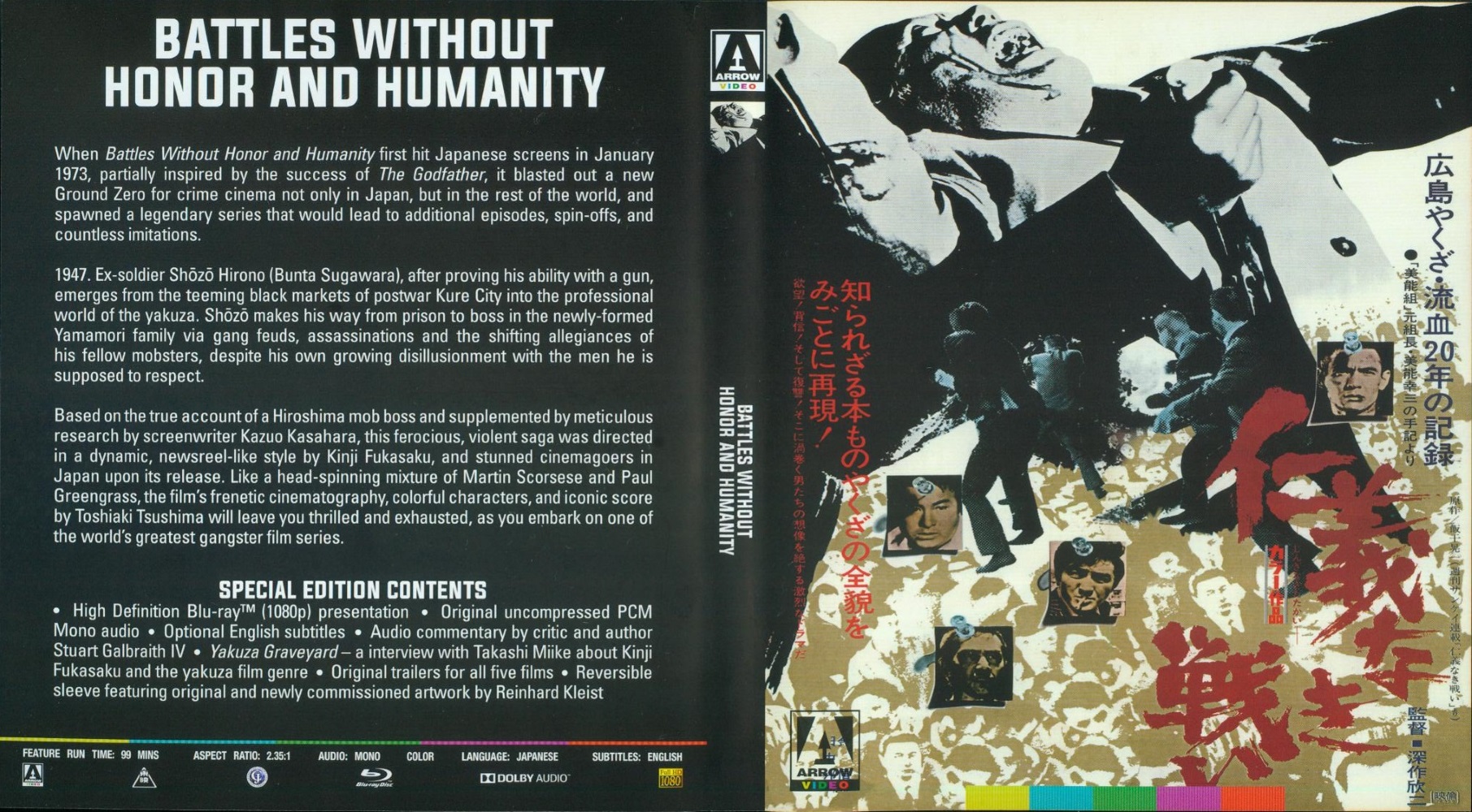 Fukasaku and his team broke with the longstanding studio tradition of casting marquee idols as honourable, kimono-clad heroes, defending their gang bosses against unscrupulous villains, and instead adapted true accounts torn from the headlines, shot in a documentary-like style, and with few clear-cut heroes or villains. The vibrancy and dynamism of the filmmaking, plus its shocking violence, Shakespearean plotlines, and wide tapestry of characters, launched a revolutionary new genre, establishing the series as one of the great masterpieces of world crime cinema.