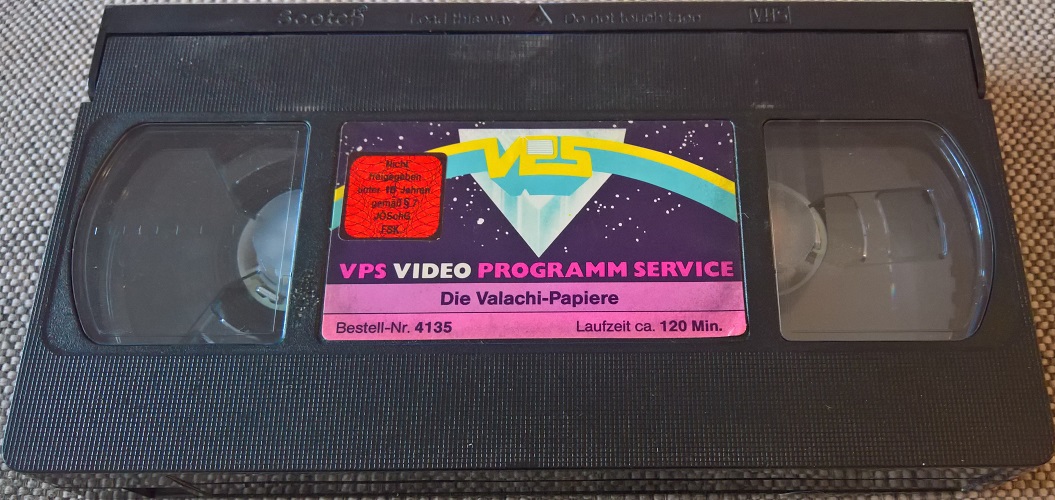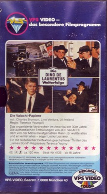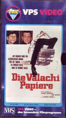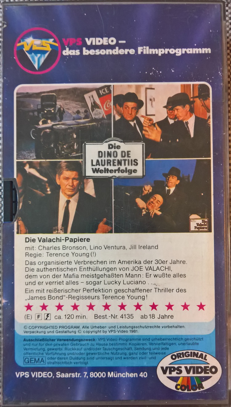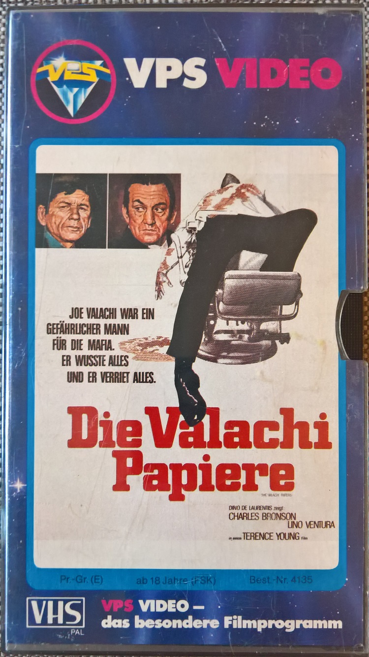 "Die Valachi-Papiere" ist 1981 von VPS auf VHS erschienen. Die Auflage kommt in der Glasbox. Ob der Film gekürzt ist kann ich nicht sagen. Ich habe keine Vergleichsfassung. Vor dem Film kommt der VPS-Einspieler, es gibt keine Trailer. Der Film hat einen kurzen deutschen Vorspann mit dem deutschen Titel. Der Abspann ist auch in deutscher Sprache. Bild und Ton sind gut. Das Bildformat ist ca. 1,52:1, original wäre wohl 1,85:1.Im Besitz von 3 Benutzern.