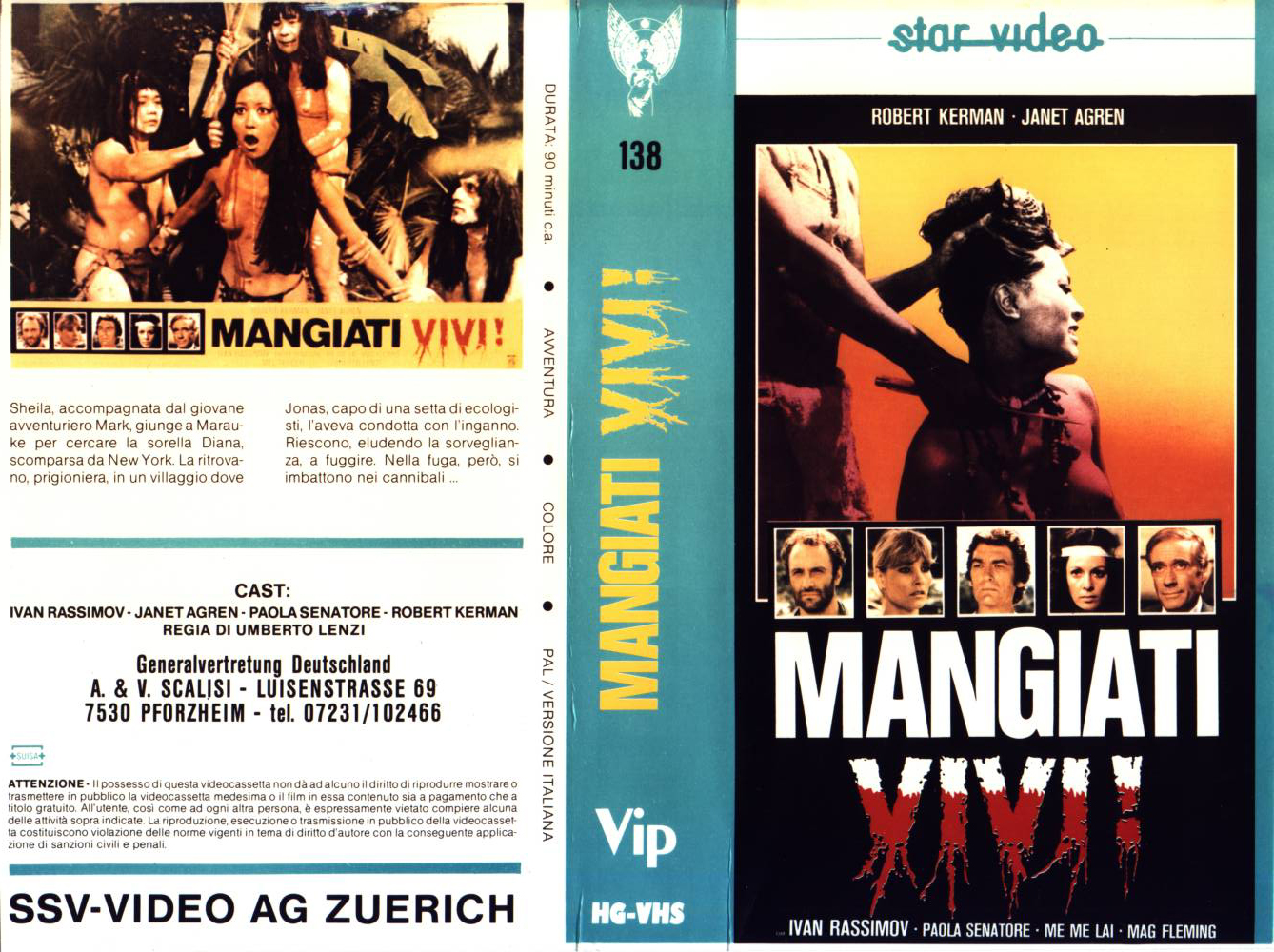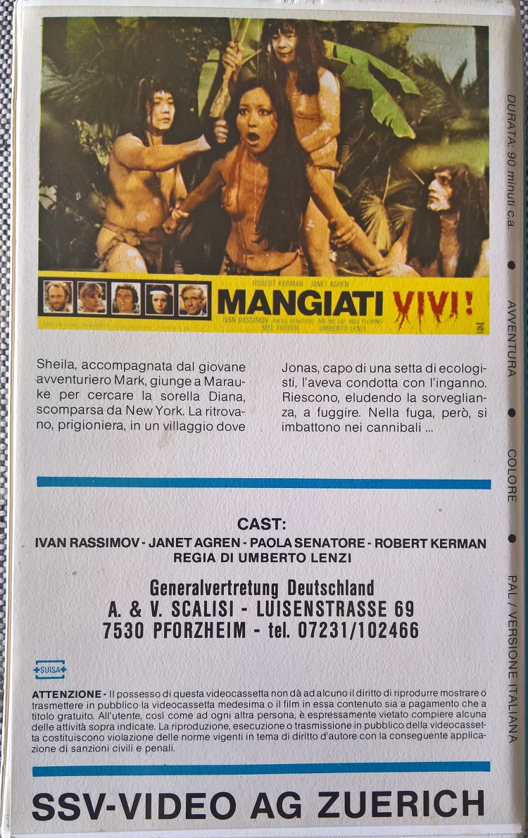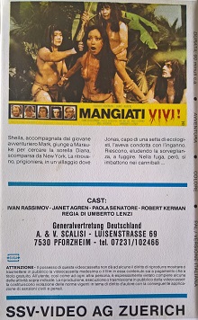"Lebendig gefressen" ist auch als italienische Auflage in Deutschland auf VHS erschienen. Im Gegensatz zur Auflage von Bavaria und GM Vilm ist die Auflage von SSV-Video aber komplett ungekürzt. SSV ist eigentlich ein Schweizer Label, welches fast ausschließlich in italienischer Sprache Filme veröffentlicht hat. Die Auflage kommt im großen Einleger. Vor dem Film kommt ein Rechtehinweis in Italienisch und das Star-Video-Logo. Es gibt keine Trailer. Vor- und Abspann sind original in Italienisch und der Titel ist laut Vorspann und Cover: "Mangiati Vivi!".Im Besitz von 2 Benutzern.