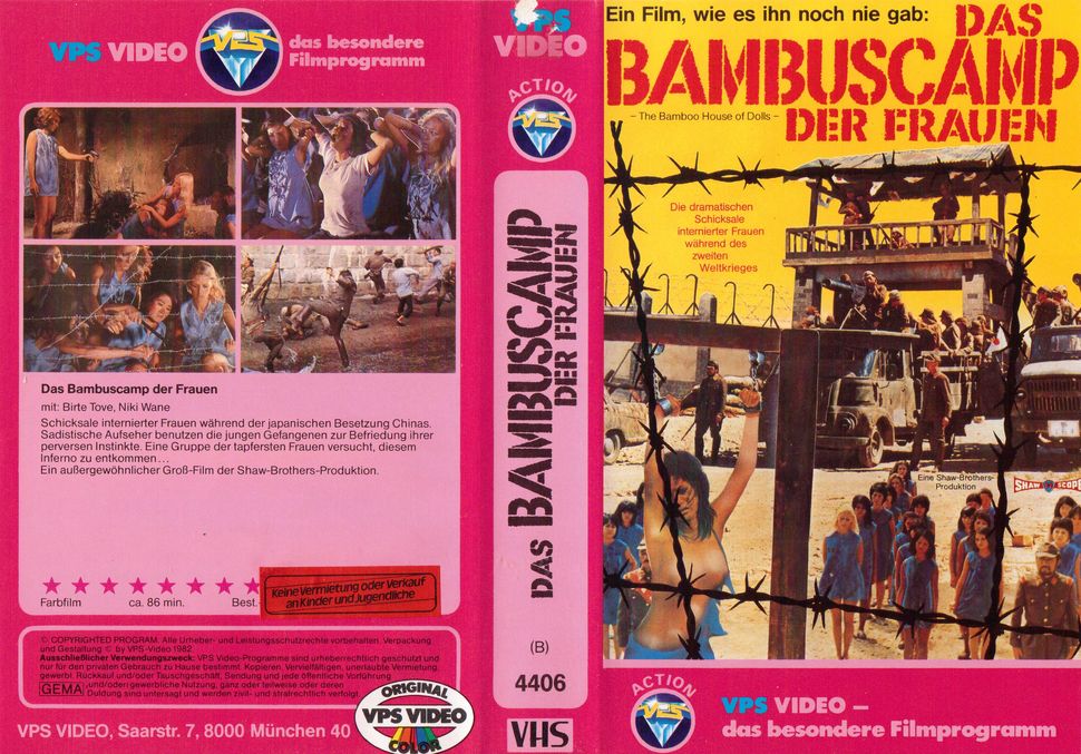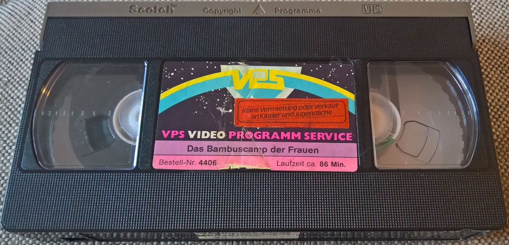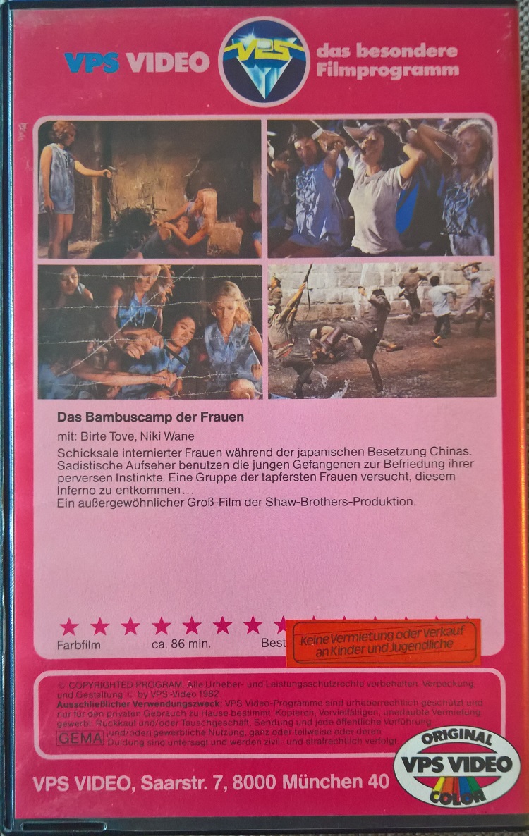 "Das Bambuscamp der Frauen" ist 1982 im Rahmen der Gelben Serie von VPS auf VHS erschienen. Das ist die Zweitauflage des Films in Deutschland. Es ist ein kleiner Einleger in kleiner Box. Der Film ist stark in Gewalt und Handlung gekürzt. Einen Schnittbericht findet man im Netz. Vor dem Film kommt der alte VPS-Einspieler. Es gibt keine Trailer. Bild und Ton sind gut. Deutscher Vorspann mit dem alten deutschen Titel. Das Bildformat ist ca. 1,96:1, original wäre 2,35:1.Im Besitz von 12 Benutzern.