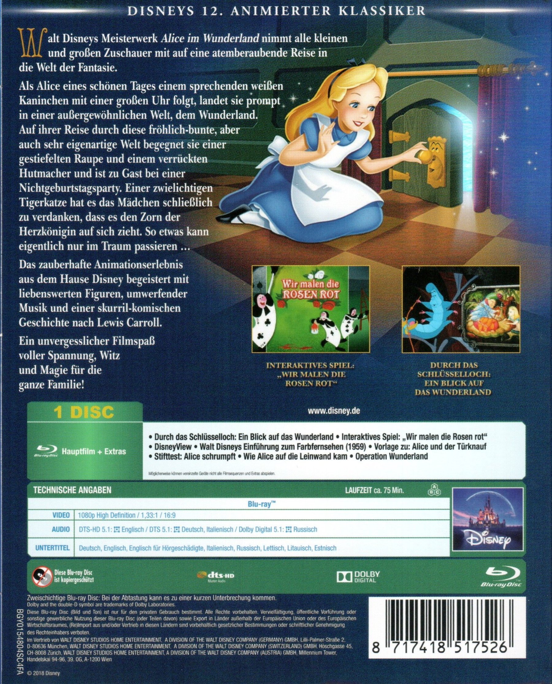 Wie Alice auf die Leinwand kam (13:27 Min.) Operation Wunderland (10:59 Min.) "I'm old" neu entdecktes Lied der Tigerkatze (3:56 Min.) Micky-Maus-Kurzfilm: "Micky im Traumland " (8:49 Min.) Eine Stunde im Wunderland (59:26 Min.) An Alice Comedy: Alice's Wonderland (8:06 Min.) 1951 Original Kino-Trailer (2:02 Min.) 1974 Original Kino-Trailer (1:53 Min.) 1954 Einführung (1:21 Min.) 1964 Einführung (1:09 Min.) Die Fred Waring Show (Ausschnitt) (30:57 Min.) Zusätzliche Szene: Pig und Pepper (3:12 Min.) Vom Wunderland ins Nimmerland: Die Erfindung eines Liedes (6:49 Min.) Zusätzliches Storyboard-Konzept: Alices Tagträume im Park (2:01 Min.) "Pass auf vor dem Jabberwock" "Alles hat einen Nutzen" "So sagten sie" "Tolle Suppe" "Traum-Karavane" "Wenn du an mich glaubst" Interaktive Kunstgalerie Trailershow (8:50 Min.)