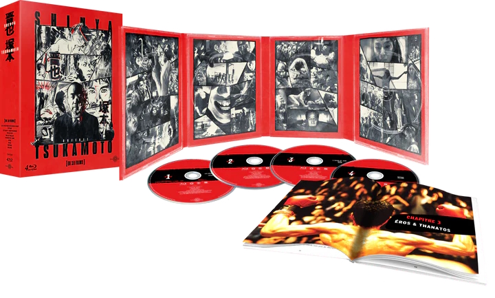 Digipack im rechts geöffneten Pappschuber aus stabilem Hartkarton inkl. 4 Blu-ray-Discs und einem 80-seitigen Booklet "Shinya Tsukamoto, l'acier, la chair et la mort" von Julien Sévéon
