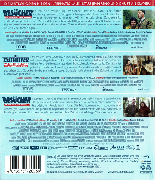 Alle drei "Die Besucher"-Teile mit Jean Reno und Christian Clavier in einer blauen Scanavo-Box. Das US amerikanische Remake "Just Visiting" ist nicht dabei. Ein Wendecover ist vorhanden.