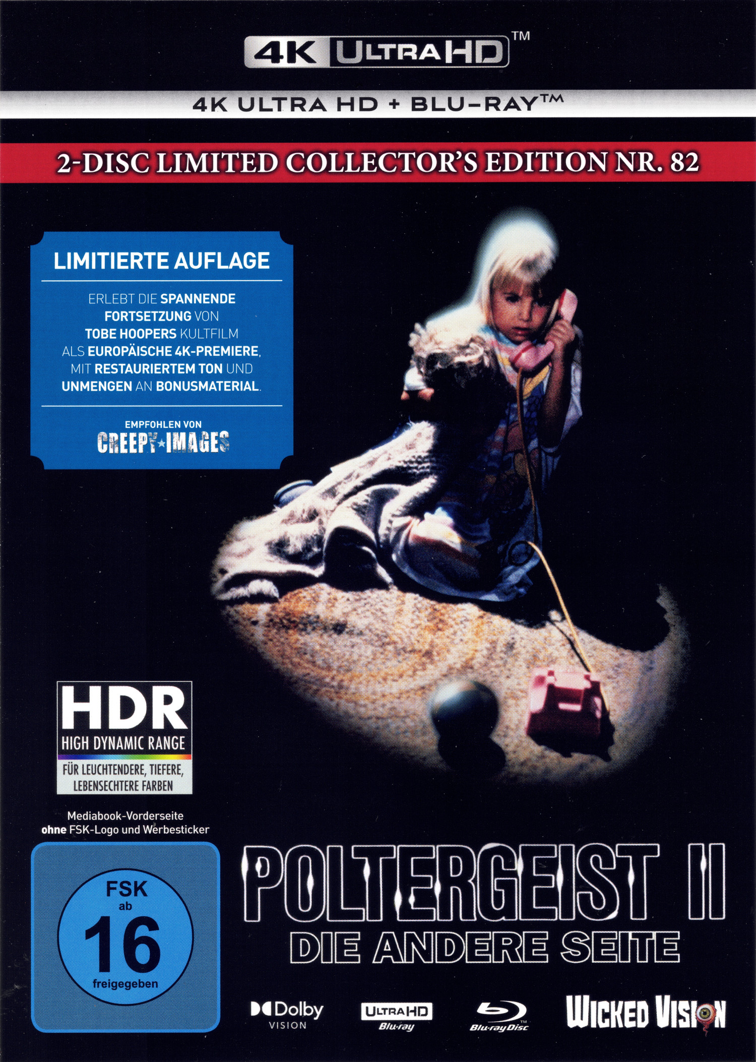 Limitiertes, nicht nummeriertes Mediabook mit dem Covermotiv E, welches den Film auf UHD und Blu-ray enthält. Das FSK-Logo und der Hinweis auf die limitierte Auflage befinden sich auf einem losen Papieraufleger auf der Vorderseite. Die rückseitigen Informationen wie die EAN, technische Daten und eine Inhaltsangabe sind aufgedruckt.