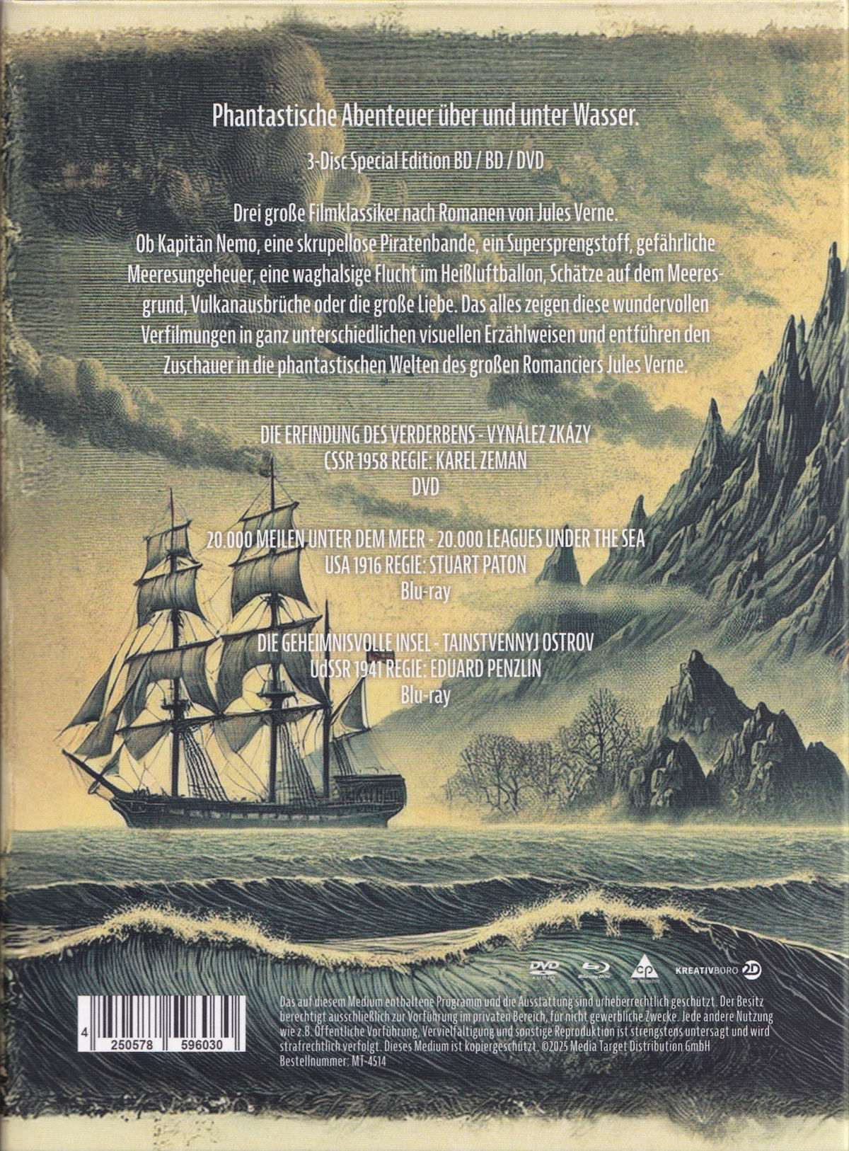 Die Jules Verne Edition besteht aus 2 Blu-ray´s und einer DVD in einem Digipak, welches auf 400 Stück limitiert ist (keine Nummerierung).