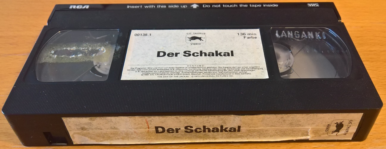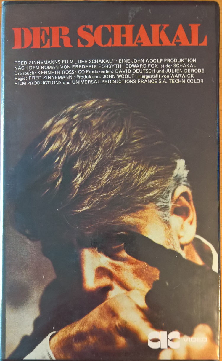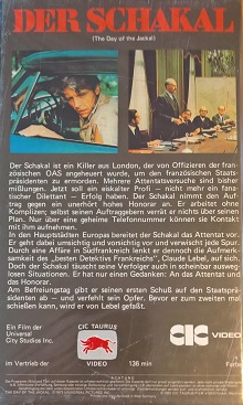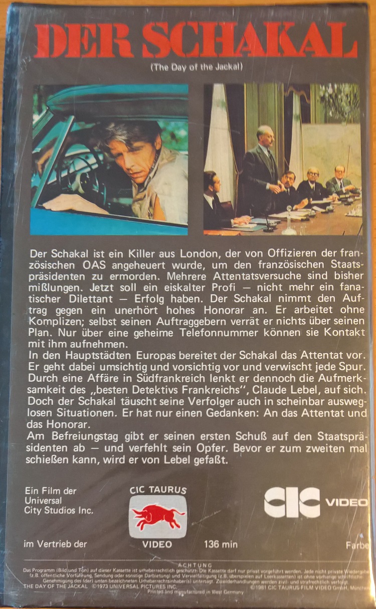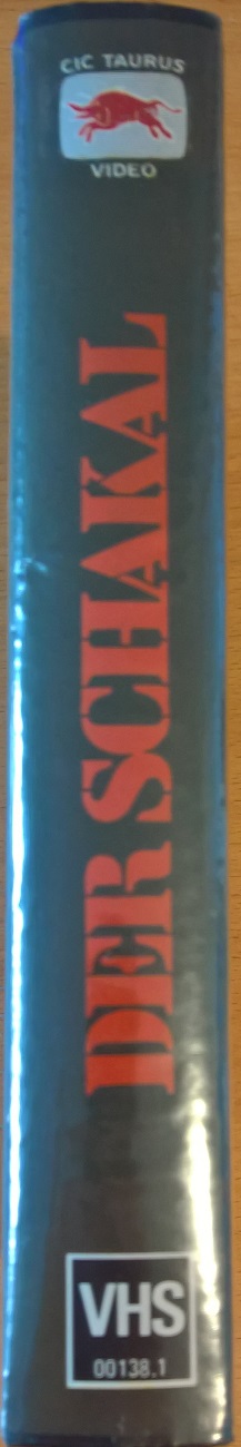 "Der Schakal" ist 1981 von CIC/Taurus auf VHS erschienen. Die Auflage kommt im großen verschweißten Einleger und ist uncut. Vor dem Film kommt das CIC-Logo und ein Taurus-Rechtehinweis, keine Trailer. Der Titel und kurze Vorspann sind in Deutsch, der Abspann ist in Englisch.Im Besitz von 4 Benutzern.