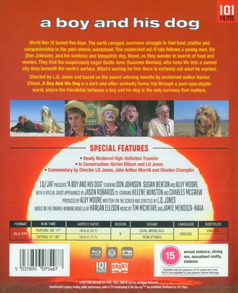 World War IV lasted five days. The earth ravaged, survivors struggle to find food, shelter, and companionship in the post-atomic wasteland. This celebrated sci-fi tale follows a young man, Vic (Don Johnson), and his sardonic and telepathic dog, Blood, as they wander in search of food and women. They find the suspiciously eager Quilla June (Susanne Benton), who lures Vic into a surreal city deep beneath the earth’s surface. What’s waiting for him there is certainly not what he wanted.