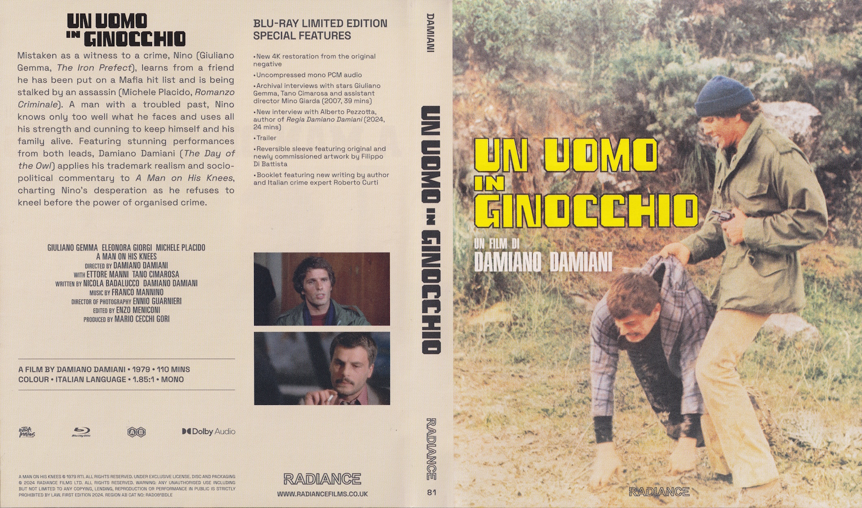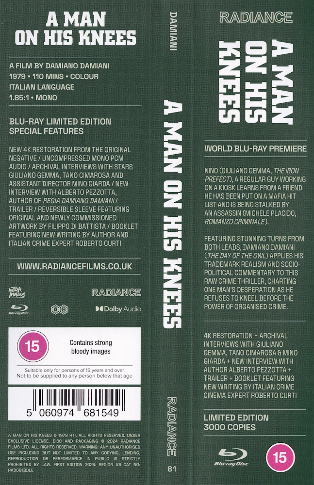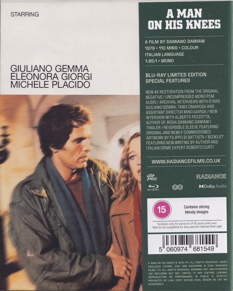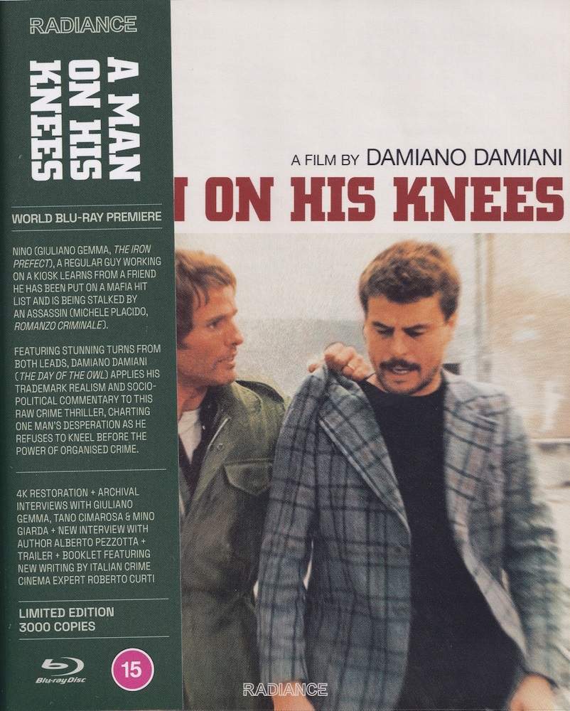 Mistaken as a witness to a crime, Nino (Giuliano Gemma, The Iron Prefect), learns from a friend he has been put on a Mafia hit list and is being stalked by an assassin (Michele Placido, Romanzo Criminale). A man with a troubled past, Nino knows only too well what he faces and uses all his strength and cunning to keep himself and his family alive. Featuring stunning performances from both leads, Damiano Damiani (The Day of the Owl) applies his trademark realism and socio-political commentary to A Man on His Knees, charting Nino’s desperation as he refuses to kneel before the power of organised crime. Newly restored in 4K, Radiance Films is proud to present one of Damiani’s finest films on Blu-ray for the first time in the world.
