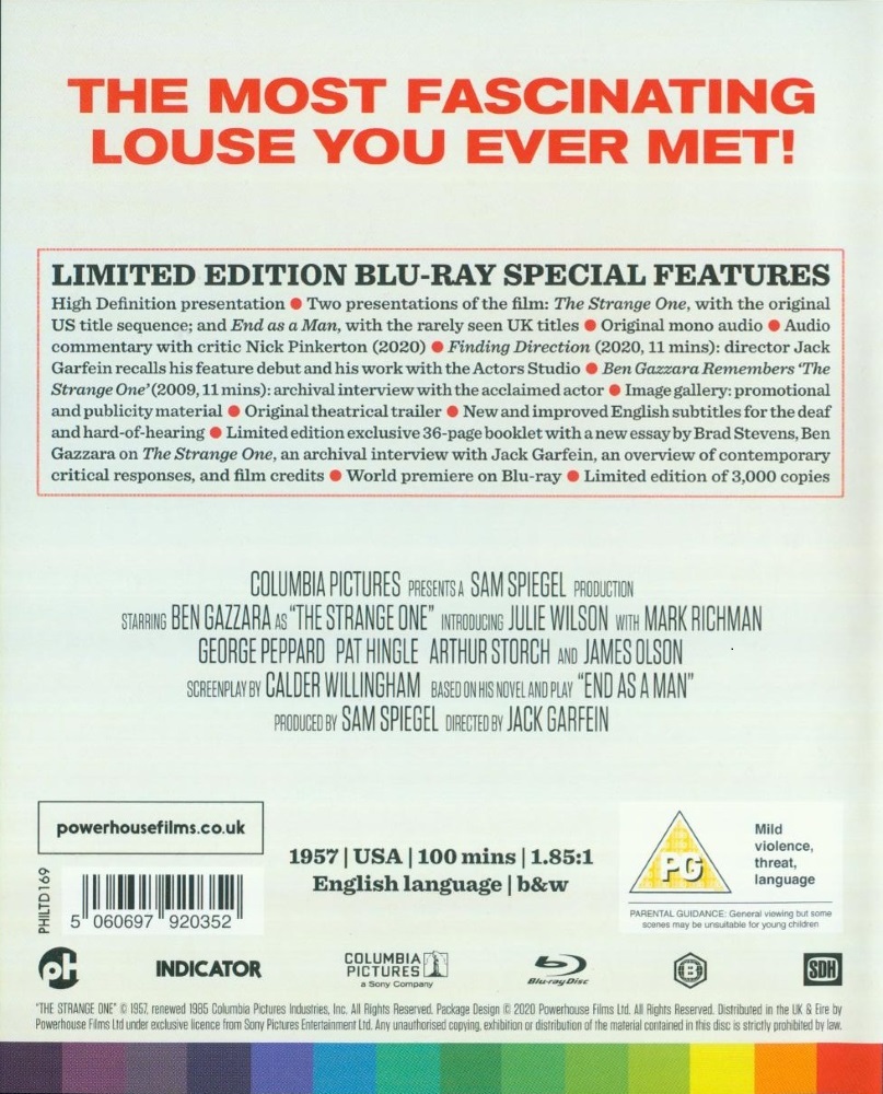 Der Hauptfilm ist in zwei Fassungen auf der Disc enthalten, der amerikanischen Kinofassung unter dem Titel "The Strange One", sowie der britischen Kinofassung unter dem ursprünglichen Titel "End as a Man". Die Fassungen unterscheiden sich nur durch ihre Titelsequenz und minimale Laufzeitunterschiede. Die Angaben zum Bildformat, zu den Tonspuren (inkl. Audiokommentar) und den Untertiteln gelten für beide Fassungen.
