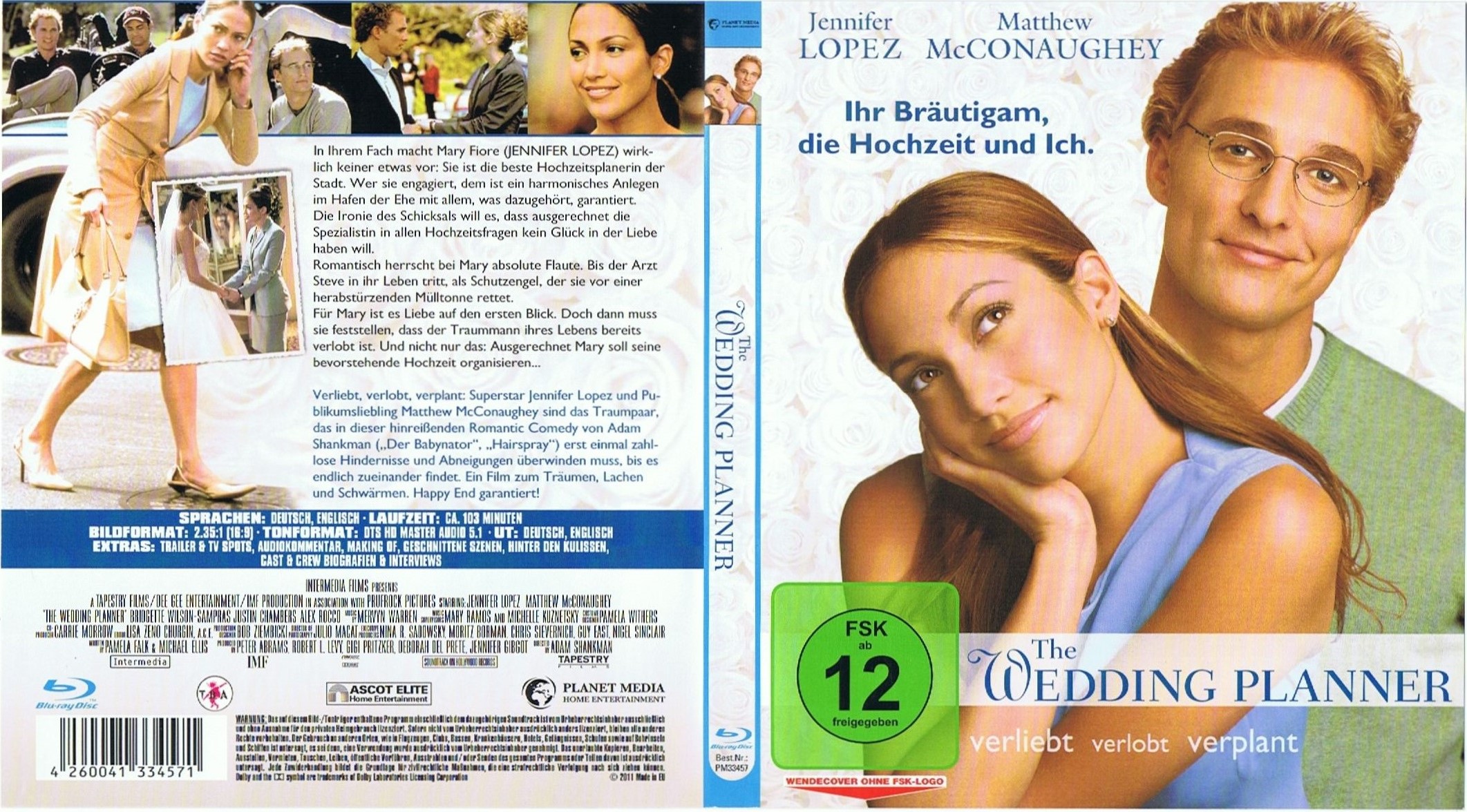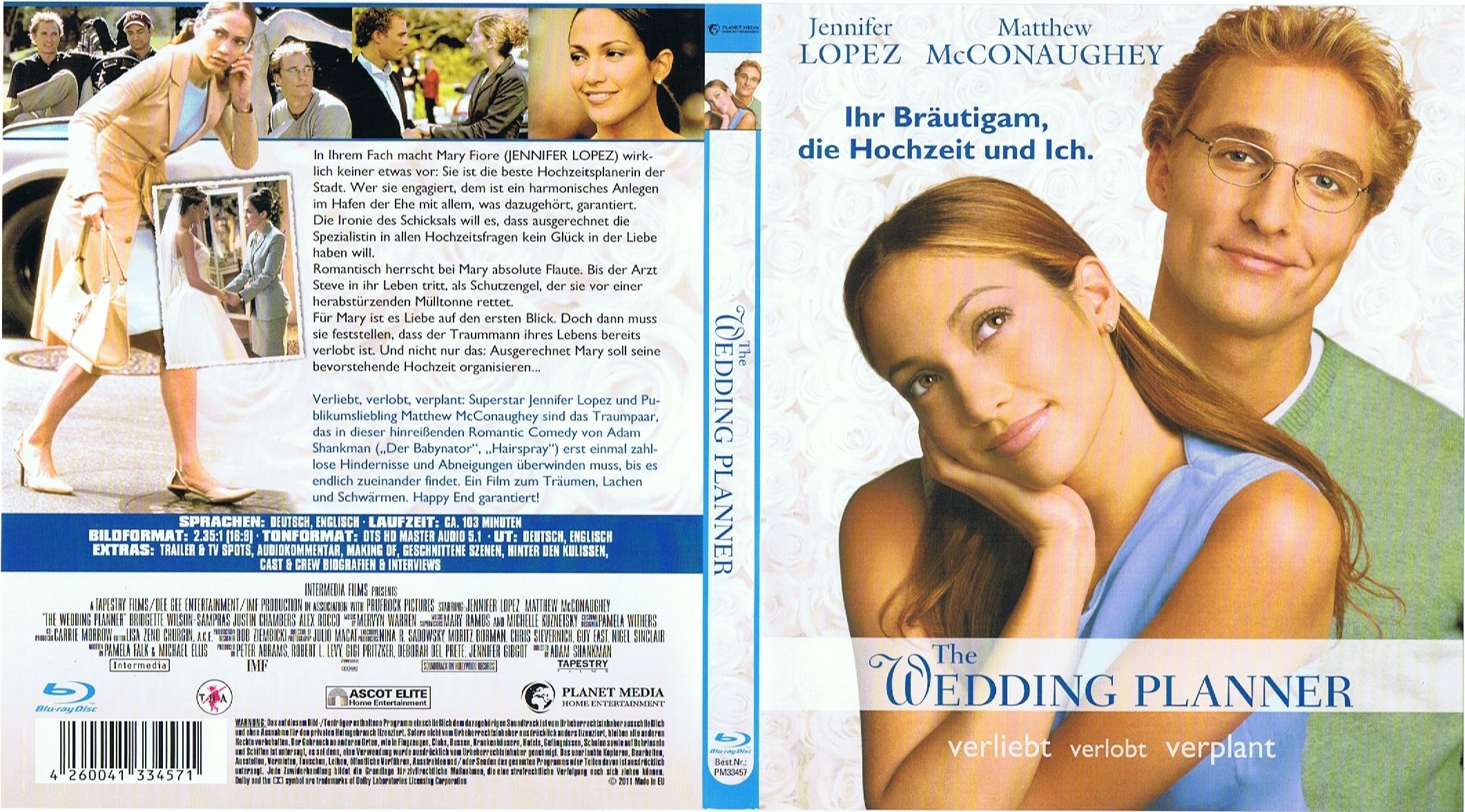 ·Audiokommentar mit Regisseur Adam Shankman und den Autoren Pamela Falk und Michael Ellis (Eng. mit dt. Untertitel) 1:43:42 Std. ·Jennifer Lopez Special oFotogalerie (mit Musik unterlegt) 2:55 Min. oMusikvideo "Love Don't Cost A Thing" 5:24 Min. oMusikvideo "I'm Real" 5:01 Min. ·Making of Featurette 3:21 Min. ·Die Tänzerin und der Cowboy 2:56 Min. ·Hinter den KulissenoAusritt 5:09 Min. oTanz 2:10 Min. oStatue 2:43 Min. oFeier 2:07 Min. oRettung 1:20 Min. ·Geschnittene Szenen (mit/ohne Audiokommentar von Regisseur Adam Shankman) oKleine Mary 0:57 Min. oDer Anruf 1:07 Min. oImmer nur lächeln 1:45 Min. oMassimos Entschuldigung 2:56 Min. oAnkunft 0:57 Min. oSitzplan 4:19 Min. oAuf dem Friedhof 1:55 Min ·Cast & CrewoBiografie §Jennifer Lopez (1 Textseite) oStatement §Jennifer Lopez 3:18 Min. oBiografie §Matthew McConaughey (1 Textseite) oStatement §Matthew McConaughey 1:53 Min. oBiografie §Bridgette Wilson-Sampras (1 Textseite) oStatement §Bridgette Wilson-Sampras 2:55 Min. oBiografie §Justin Chambers (1 Textseite) oStatement §Justin Chambers 1:57 Min. oBiografie §Judy Greer (1 Textseite) oStatement §Judy Greer 0:53 Min. oBiografie §Adam Shankman (1 Textseite) oStatement §Adam Shankman 1:16 Min. ·Trailer & TV-Spots oWedding Planner §Dt. Kinotrailer 2:20 Min. §US Kinotrailer 1 2:09 Min. §US Kinotrailer 2 2:31 Min. §US Promotion Trailer 3:18 Min. §TV Spot 1 0:21 Min. §TV Spot 2 0:21 Min. §TV Spot 3 0:21 Min. §TV Spot 4 0:11 Min. §US TV Spot 1 0:35 Min. §US TV Spot 2 0:35 Sek. §US TV Spot 3 0:16 Min. oDer Fall Mona 2:27 Min. oRules - Sekunden der Entscheidung 2:23 Min.