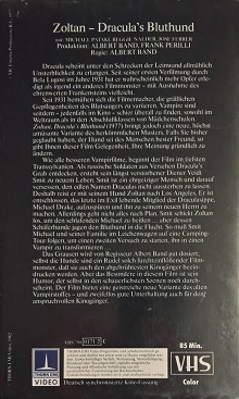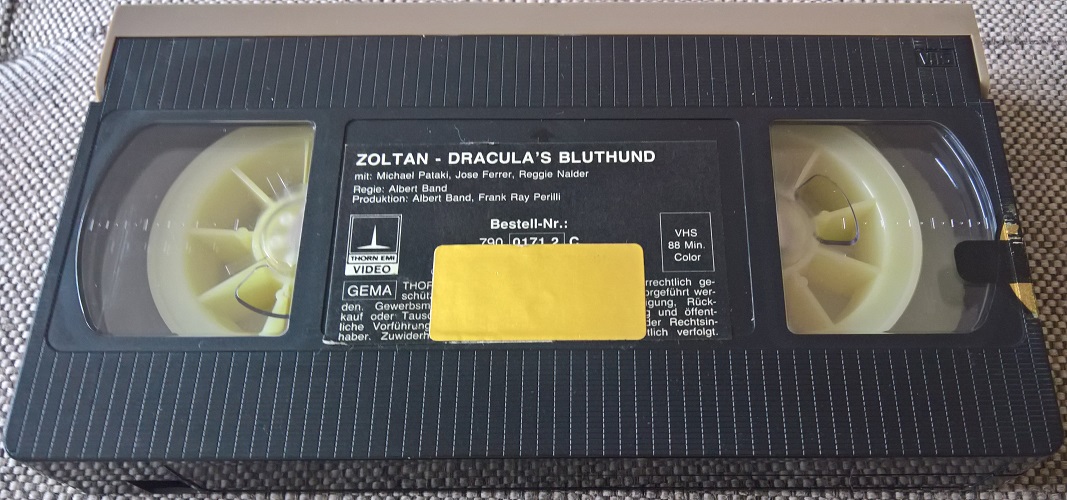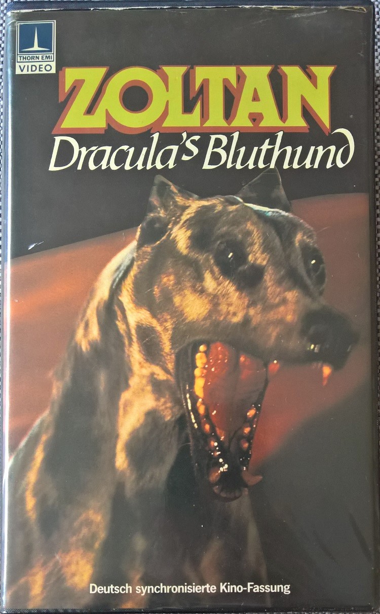 "Zoltan - Draculas Bluthund" ist 1982 von Thorn EMI auf VHS erschienen. Die Auflage kommt im großen Einleger und ist uncut. Auf der Kassette ist nur der Film. Es gibt keine Logos oder Trailer. Gutes Bild und guter Ton. Original Vor- und Abspann, ganz am Anfang wird der deutsche Titel in roter Schrift eingeblendet.Im Besitz von 9 Benutzern.