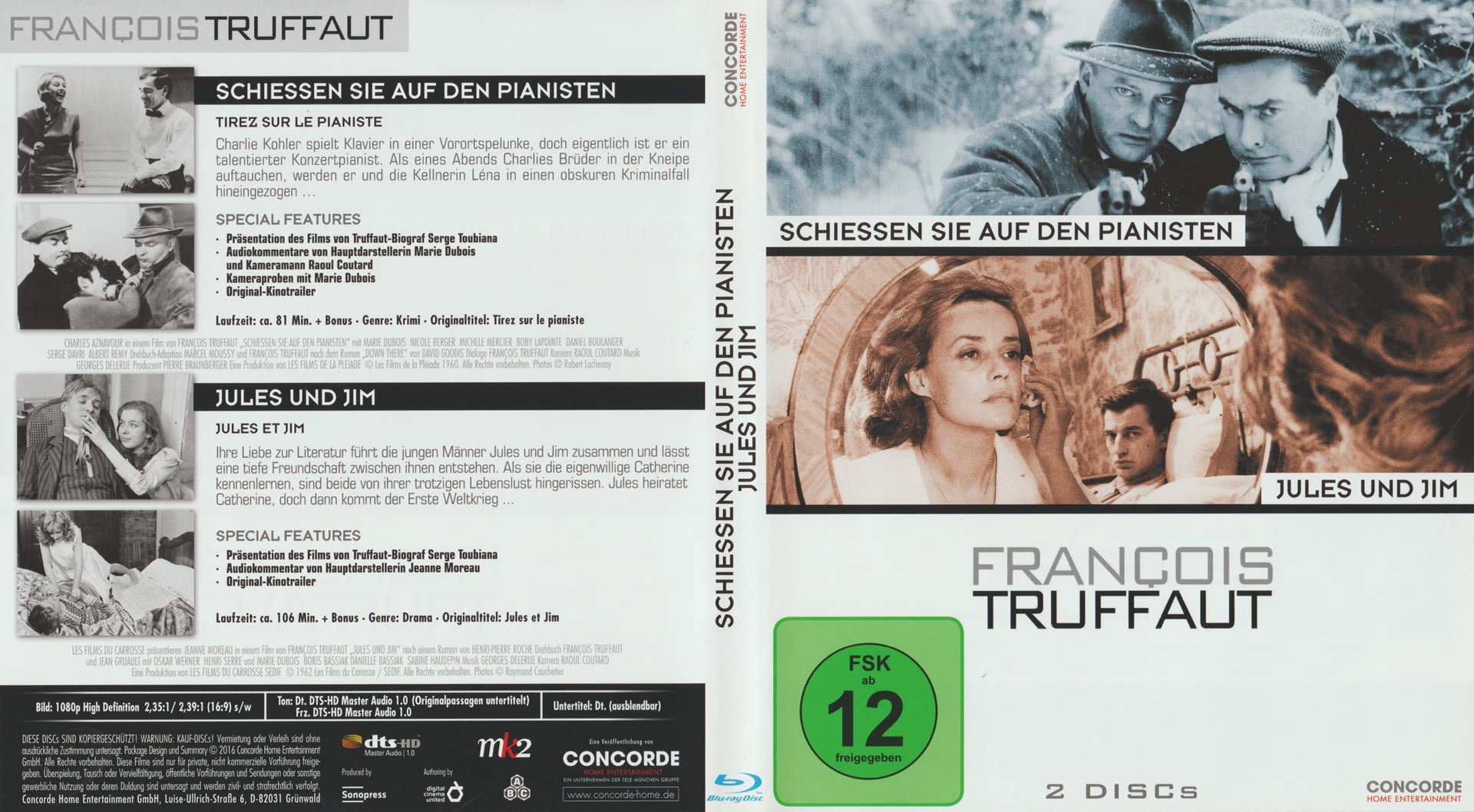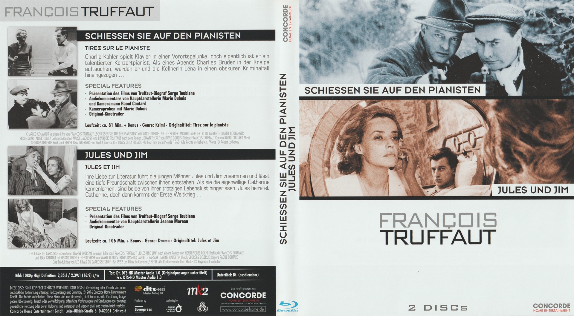 "François Truffaut Collection 2": Vier Blu-ray-Discs in zwei Amaray-Hüllen, die in einer nach rechts geöffneten Hartkartonbox stecken. Die Edition enthält folgende Filme: