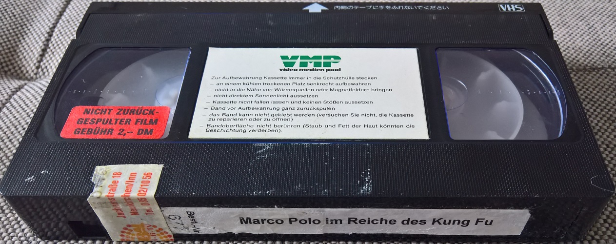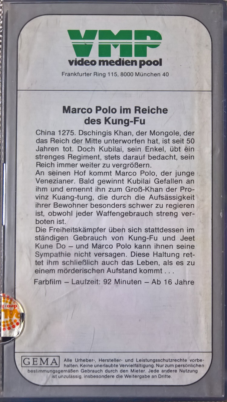 "Marco Polo im Reiche des Kung-Fu" ist Anfang der 80er Jahre auch von VMP in der Glasbox erschienen. Die Auflage entspricht dem ITT-Pappschuber und ist ebenfalls stark in Action und Gore geschnitten. Vor dem Film kommt der VMP-"Horrido"-Einspieler. Es gibt keine Trailer. Titel im Film ist "Marco Polo im Reiche des Kublai-Khan". Danach folgt der originale Shaw-Brothers-Vorspann in Chinesisch und Englisch. Sehr seltene VMP-Glasbox.Im Besitz von 3 Benutzern.