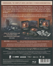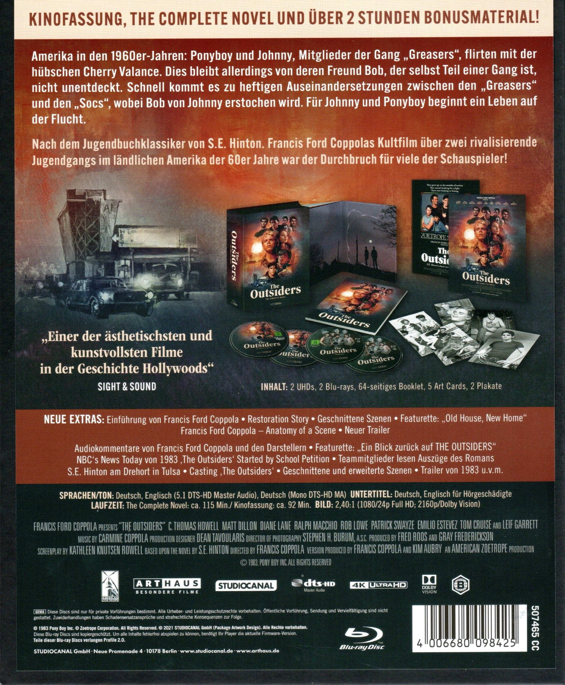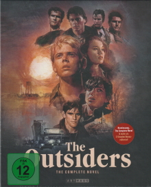 The Outsiders - The Complete Novel als Limited Collector's Edition mit zwei UHD Blu-rays und zwei Blu-rays in einem buchähnlichen Karton. Das Beiblatt mit Infos und technischen Angaben auf der Rückseite ist mittels zwei Klebepunkten fixiert. Die Discs sind in einem Digipak untergebracht.