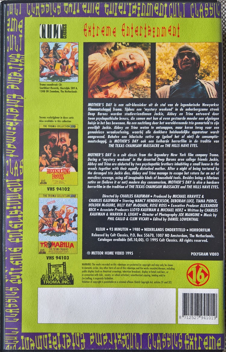 "Mother´s Day" ist 1995 in Holland auf VHS erschienen. Die Auflage kommt im großen Einleger und ist uncut. Der Film ist in der "Troma Collection" erschienen. Bild und Ton sind sehr gut. Es gibt keine Untertitel, obwohl sie auf dem Cover explizit erwähnt werden. Vor dem Film kommt das Troma-Logo und der "Cult Classics"-Schriftzug. Erschienen laut Cover 1995, laut Kassettenaufkleber von 1994.Im Besitz von 5 Benutzern.