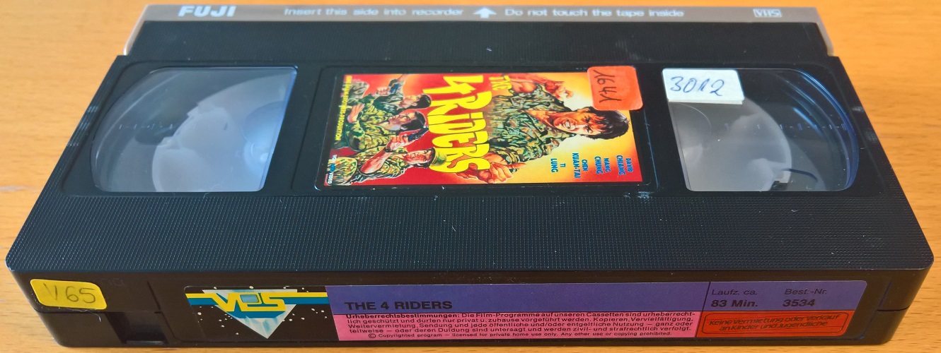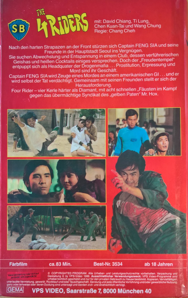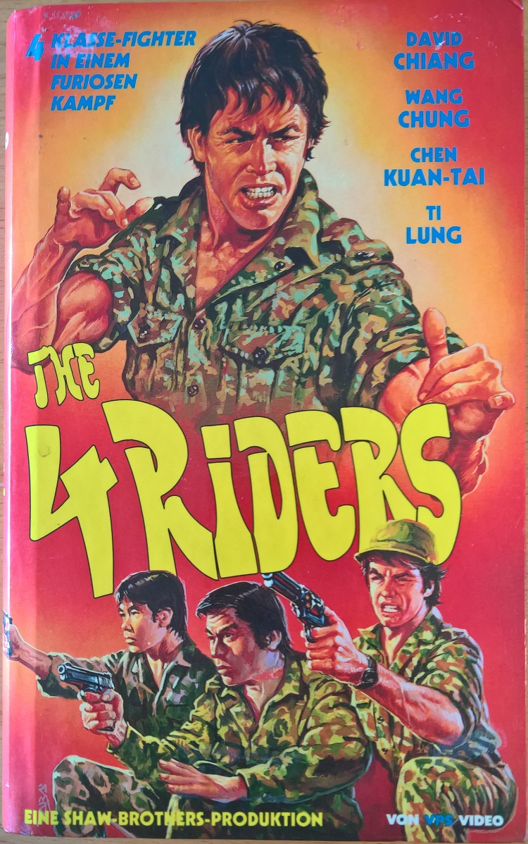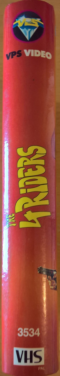 "Four Riders" ist 1986 als Neuauflage von VPS erschienen. Die Auflage kommt in einer großen Hartbox und ist identisch zum Pappschuber geschnitten. Vor dem Film kommt der VPS Einspieler. Das Shaw Brothers Logo vor dem Film fehlt, daher ist die Laufzeit 13 Sek. kürzer.Im Besitz von 7 Benutzern.