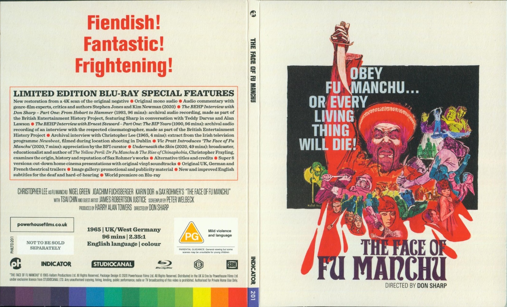 Banderole mit Indicator-Farbspektrum, BBFC-Logo, Filmtiteln, Poster-Vorschau, individueller Limitierungsangabe und Werbe-Tagline "The Sinister Minister of fear is Here".