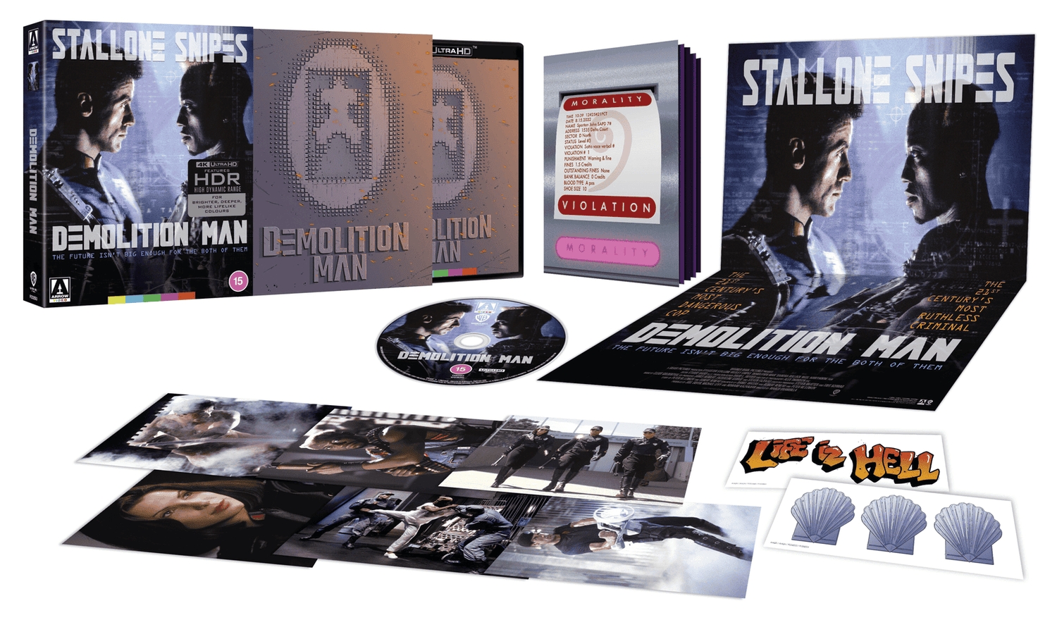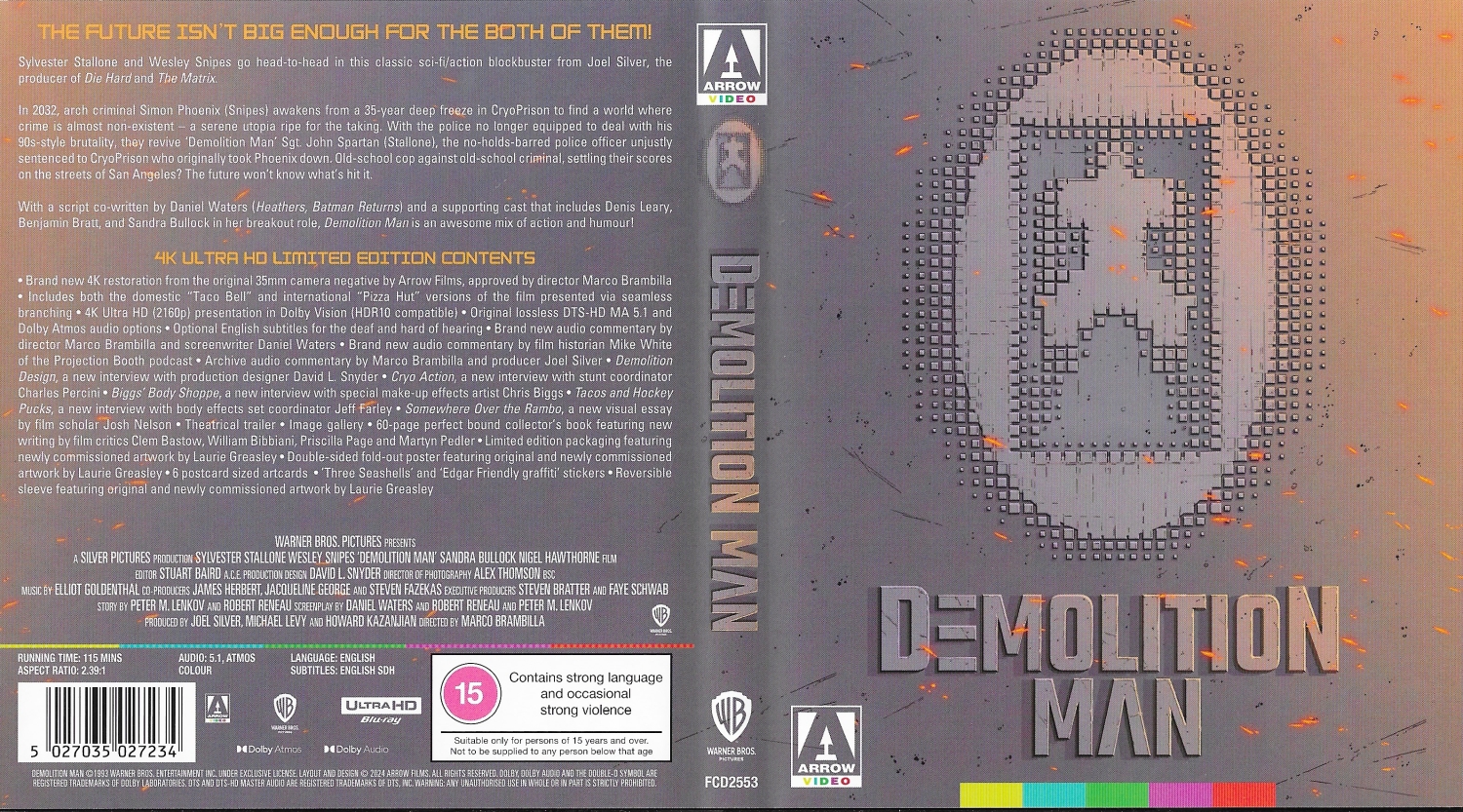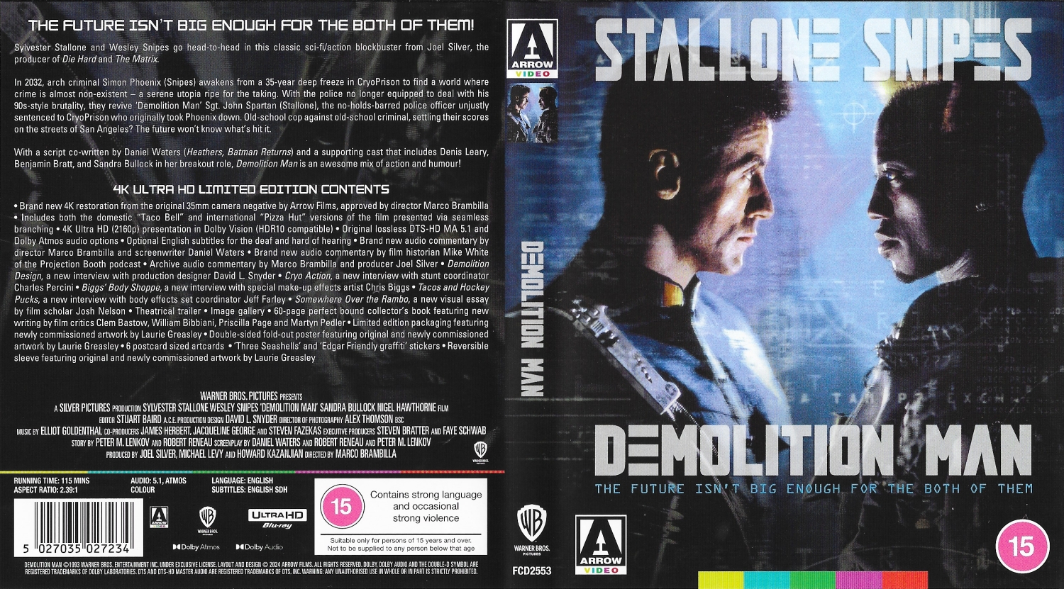 Demolition Man, erstmals auf 4K ("Brand new 4K restoration from the original 35mm camera negativ by Arrow Films, approved by director Marco Brambilla"). Die Limited Edition von Arrow Video bietet neben der US Version ("Taco Bell"-Version) auch noch die Internationale Version ("Pizza Hut"-Version). Siehe auch den (aktualisierten) Schnittbericht.