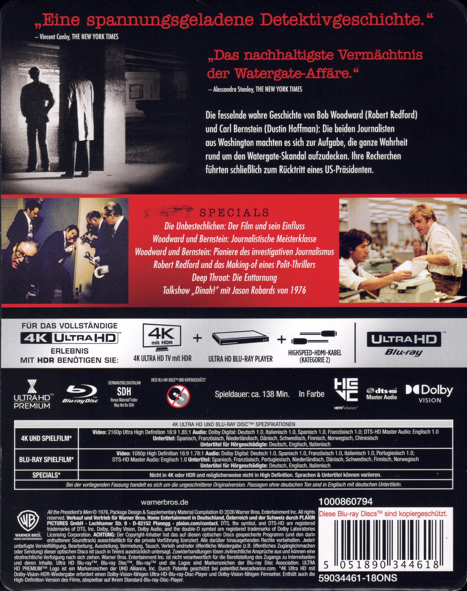 Limitiertes, nicht nummeriertes Steelbook, welches den Film auf UHD und Blu-ray enthält. Das FSK-Logo, die EAN, technische Daten und eine Inhaltsangabe befinden sich auf einem Papieraufleger (J-Card), welcher mit einem Aufkleber befestigt ist. Die Vorderseite des Steelbooks ist geprägt. Es handelt sich um die weltweite 4K-Premiere.